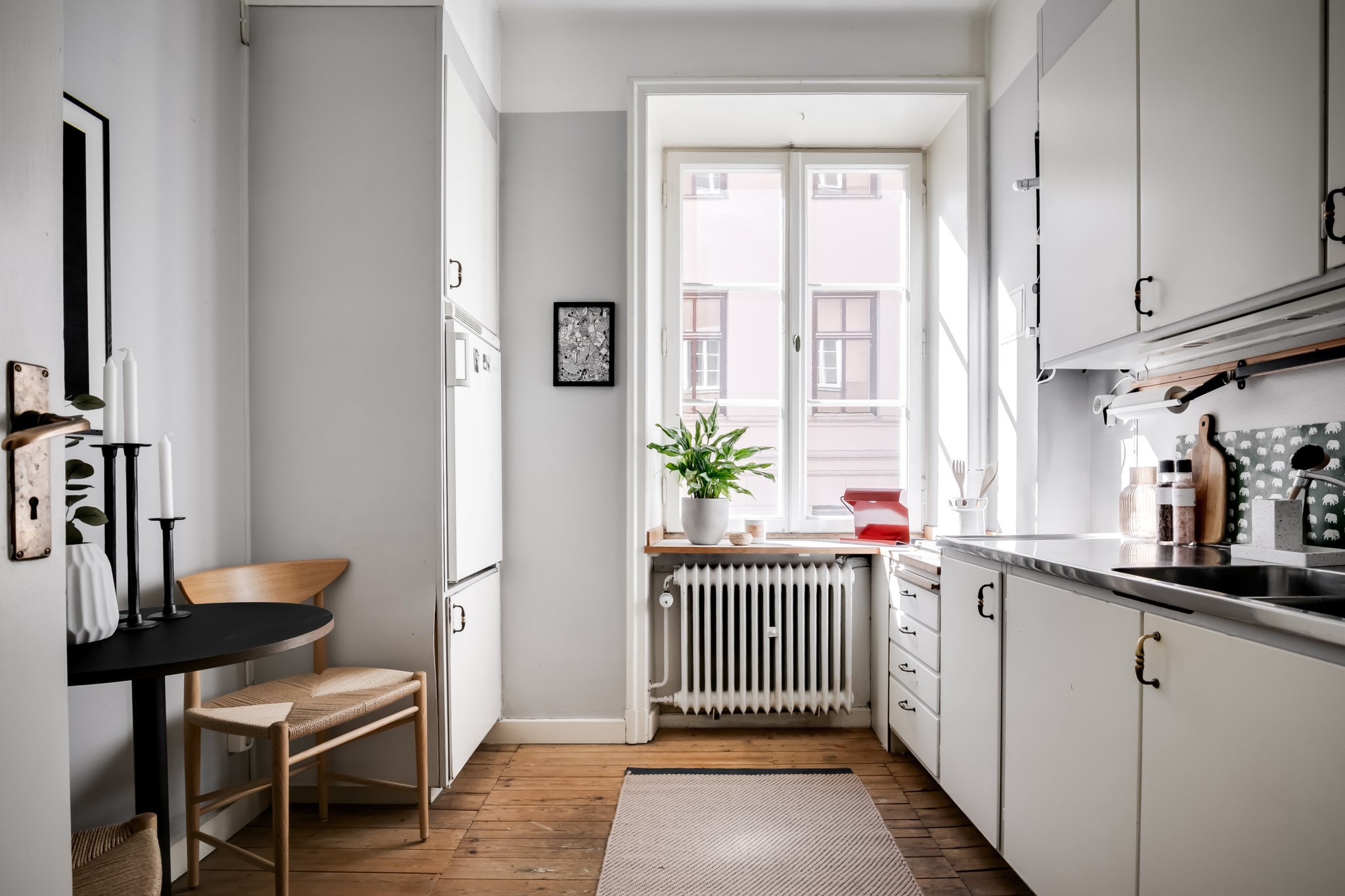 Solig innergård med planteringar och tillgång till utemöbler.