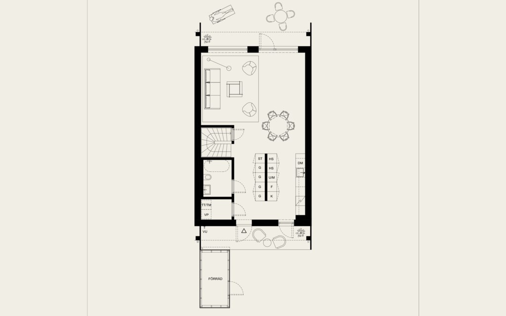 Vardagsrum som knyter samman husets övriga utrymen på entréplan